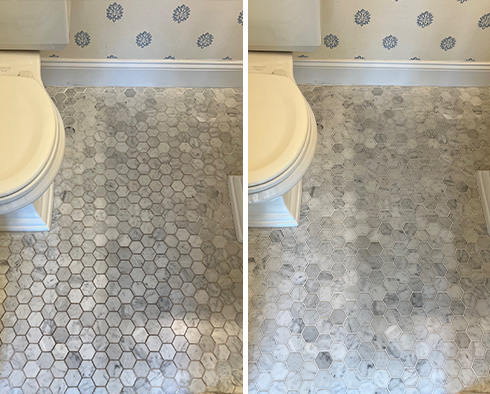 A homeowner in Chestnut Hill, MA, wanted to restore his bathroom floor. The surface had deteriorated over the years, leaving dark grout lines.