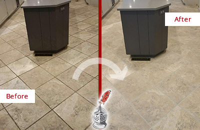 Before and After Picture of a Black Marble Tile Floor Regrouted to Change Grout ColorBefore and After Picture of a Kitchen Tile Floor Regrouted to Remove Soil
