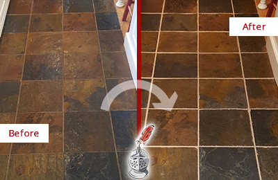 Before and After Picture of a Slate Tile Floor Regrouted to Replace Missing GroutBefore and After Picture of a Tile Office Lobby Floor Regrouted to Remove Embedded Dirt